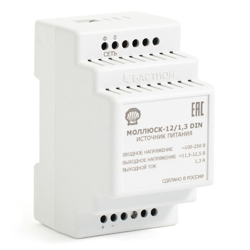 ИВЭП МОЛЛЮСК-12/1,3 DIN - Источник питания 12 В, 1,3 А. Расширенный сетевой диапазон 100-250 В. Корпус на DIN рейку, защита выхода от КЗ и перегрузки, прочность изоляции — 3 кВ. Источник питания Моллюск-12/1,3 DIN (далее по тексту - источник) предназначен для питания радиоэлектронных устройств широкого применения напряжением 12 В постоянного тока от сети переменного тока напряжением 220 В. Источник защищен от перегрузки и короткого замыкания на выходе, работоспособен на холостом ходу.